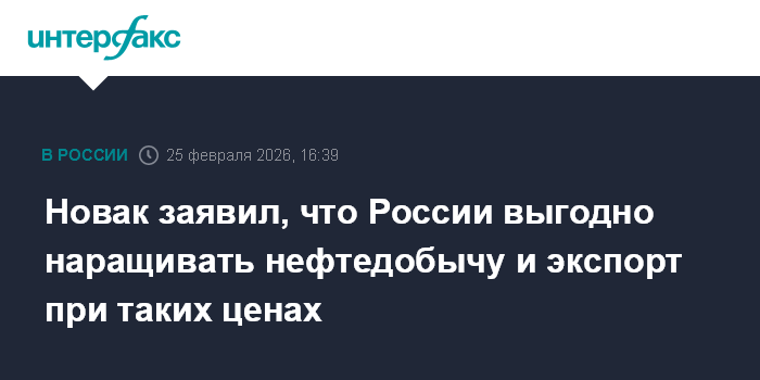 Москва. 25 февраля. INTERFAX.RU - России выгодно в текущих ценовых условиях наращивать добычу нефти и ее экспорт, сообщил журналистам вице-премьер Александр Новак, отвечая на соответствующий вопрос.