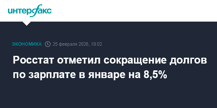 Москва. 25 февраля. INTERFAX.RU - В России просроченная задолженность по заработной плате на конец января 2026 года составила 1 млрд 855,9 млн рублей и по сравнению с декабрем снизилась на 171,3 млн рублей, или на 8,5%, сообщил Росстат.