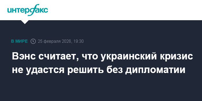 Москва. 25 февраля. INTERFAX.RU - Вице-президент США Джей Ди Вэнс в среду заявил, что для разрешения украинского кризиса нужно продолжать действовать дипломатическими средствами.