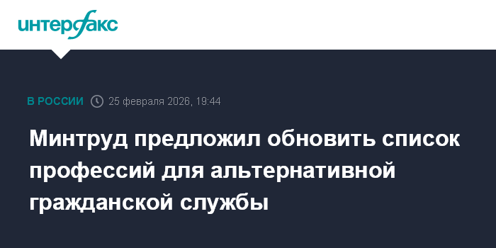 Москва. 25 февраля. INTERFAX.RU - Минтруд РФ разработал проект приказа, которым актуализируется список профессий, по которым в 2026 году можно будет пройти альтернативную гражданскую службу (АГС), а также расширяется число организаций, где такую службу можно проходить, сообщила пресс-служба министерства в среду.