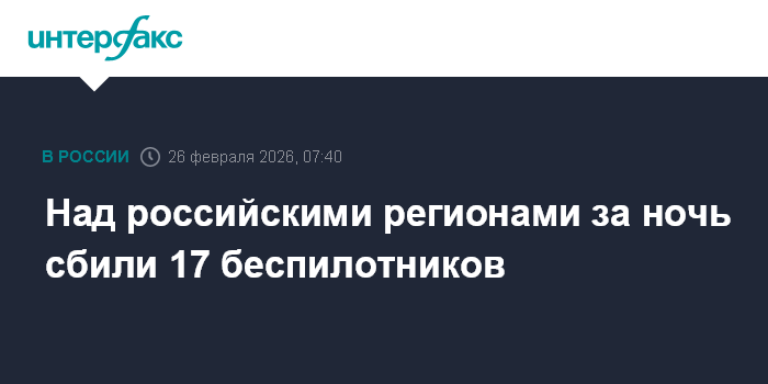 Москва. 26 февраля. INTERFAX.RU - Российские военные в ночь на четверг перехватили и уничтожили 17 беспилотников над пятью регионами России, а также акваториями Черного и Азовского морей, сообщили в Минобороны РФ.