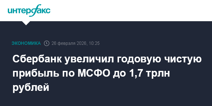 Москва. 26 февраля. INTERFAX.RU - Сбербанк в 2025 году увеличил чистую прибыль по МСФО на 7,9% - до 1 705,9 млрд рублей против 1 580,3 млрд рублей прибыли в 2024 году, сообщил банк.