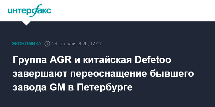 Москва. 26 февраля. INTERFAX.RU - Российский "АГР Холдинг" и китайская Defetoo расширяют стратегическое партнерство и завершают техническое перевооружение петербургской площадки AGR - бывшего завода американской General Motors в Шушарах, сообщила группа AGR.