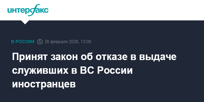 Москва. 26 февраля. INTERFAX.RU - Госдума приняла во втором и в третьем чтении законопроект об отказе в выдаче иностранному государству иностранцев, служивших в Вооруженных силах России, участников СВО.