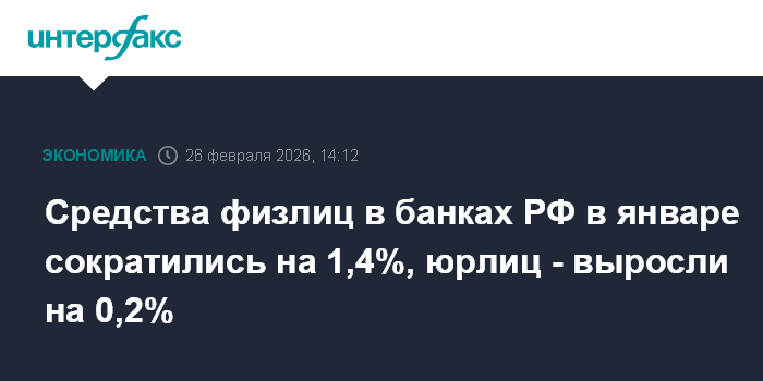 Москва. 26 февраля. INTERFAX.RU - Средства клиентов российских банков в январе 2026 года сократились на 0,6% (без учета счетов эскроу) после роста на 3,2% в декабре, говорится в обзоре ЦБ РФ о развитии банковского сектора.