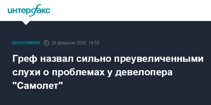 Москва. 26 февраля. INTERFAX.RU - Глава Сбербанка Герман Греф прокомментировал ситуацию вокруг застройщика "Самолет": у компании достаточно ликвидности для обслуживания обязательств.
