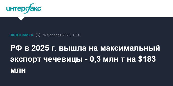 Москва. 26 февраля. INTERFAX.RU - Экспорт чечевицы из РФ в 2025 году достиг исторического максимума - 0,3 млн тонн на $183 млн, сообщает федеральный центр "Агроэкспорт".
