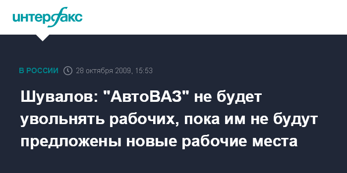 Москва. 28 октября. INTERFAX.RU - "АвтоВАЗ" не будет увольнять рабочих, пока для них не будут предложены новые рабочие места, заявил в среду журналистам первый вице-премьер РФ Игорь Шувалов, комментируя ситуацию вокруг компании. "Будет предложено поменять работу только тогда, когда будут созданы новые рабочие места. Никому не будем предлагать ни уволиться, ни оформить пенсию, пока не будут предложены новые рабочие места", - заявил он.