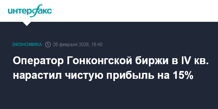 Москва. 26 февраля. INTERFAX.RU - Hong Kong Exchanges & Clearing Ltd. (HKEx), оператор Гонконгской фондовой биржи, увеличил выручку и чистую прибыль в четвертом квартале 2025 года на 15%.