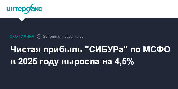Москва. 26 февраля. INTERFAX.RU - Чистая прибыль ПАО "СИБУР Холдинг" по международным стандартам (МСФО) в 2025 году выросла на 4,5% - до 205,149 млрд рублей, сообщила компания. На неё повлияли положительные курсовые разницы в размере почти 90 млрд рублей от укрепления рубля и соответствующей переоценки валютных долговых обязательств, несмотря на рост процентных расходов.
