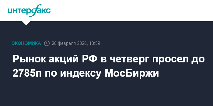Москва. 26 февраля. INTERFAX.RU - Российский рынок акций завершил торги в четверг снижением в отсутствие новостей о дате дальнейших переговоров по украинскому урегулированию и на смешанных сигналах с мировых рынков; фактором поддержки вечером выступила выросшая нефть (фьючерс на Brent поднялся к $72 за баррель после локального отката к $69,2 за баррель). Индекс МосБиржи опустился до 2785 пунктов, при этом реакция рынка на вышедшие с утра финотчеты ряда крупных компаний оказалась нейтральной.