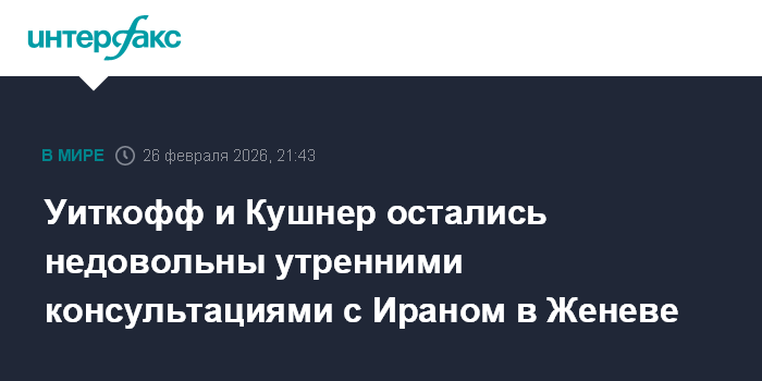 Москва. 26 февраля. INTERFAX.RU - Спецпосланнику президента США Стиву Уиткоффу и зятю президента Джареду Кушнера не понравились предложения, которые они получили от Ирана в ходе утренних переговоров в Женеве, сообщает Axios со ссылкой на источник.