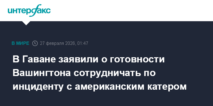 Москва. 27 февраля. INTERFAX.RU - Гавана получила от Вашингтона сигналы о готовности сотрудничать при расследовании недавнего инцидента с американским катером, сообщил замглавы МИД Кубы Карлос Фернандес де Коссио.