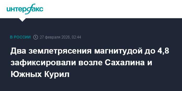Москва. 27 февраля. INTERFAX.RU - Два землетрясения магнитудой 4,8 и 3,9 зарегистрировали сейсмологи утром в пятницу возле Южных Курил и Сахалина, сообщили "Интерфаксу" в Сахалинском филиале Единой Геофизической службы РАН.