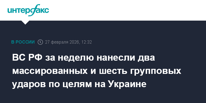 Москва. 27 февраля. INTERFAX.RU - Вооружённые силы России за неделю нанесли два массированных и шесть групповых ударов по целям на Украине, сообщило министерство обороны РФ в пятницу.