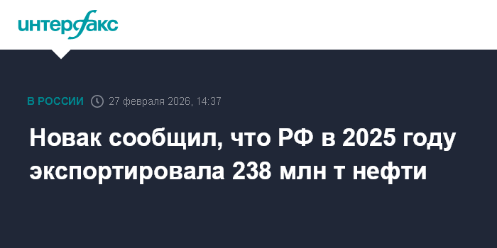 Москва. 27 февраля. INTERFAX.RU - Экспорт нефти из России по итогам 2025 года составил 238 млн тонн, сообщается в презентации вице-премьера Александра Новака, подготовленной в рамках лектория "Большие идеи" в Сириусе.