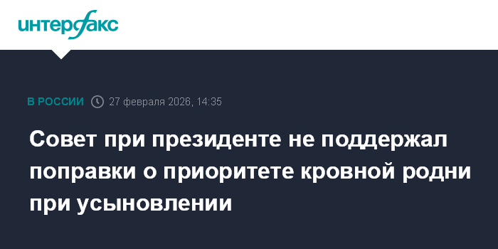 Москва. 27 февраля. INTERFAX.RU - Совет при президенте по кодификации и совершенствованию гражданского законодательства не поддержал депутатский законопроект № 1107441-8 о введении термина "кровно-родственные связи".