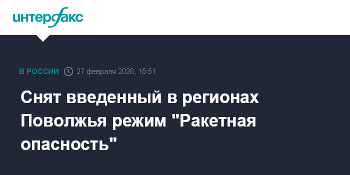 Москва. 27 февраля. INTERFAX.RU - Режим "Ракетная опасность", введенный днем в пятницу, отменен в девяти субъектах Поволжья, сообщается в приложении МЧС России.