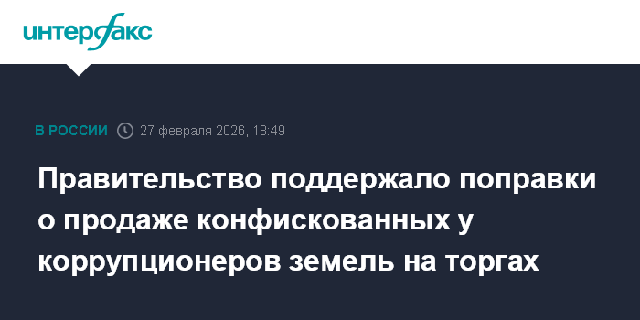 Москва. 27 февраля. INTERFAX.RU - Правительство поддержало законопроект № 1162925-8, который позволит государству продавать земельные участки под застройку, конфискованные в рамках антикоррупционного законодательства.