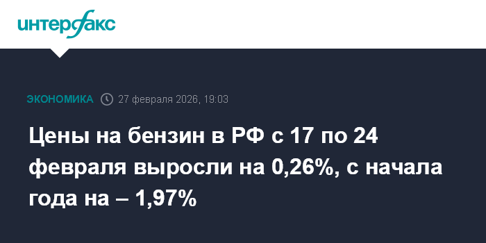 Цены на бензин в РФ с 17 по 24 февраля выросли на 0,26%, с начала года на – 1,97%