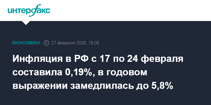 Инфляция в РФ с 17 по 24 февраля составила 0,19%, в годовом выражении замедлилась до 5,8%