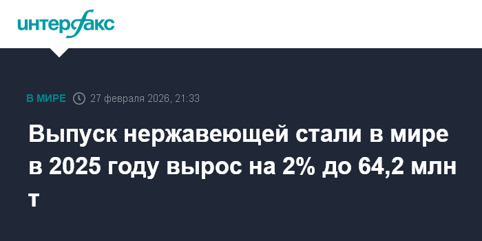Москва. 27 февраля. INTERFAX.RU - Мировое производство нержавеющей стали в 2025 году выросло на 2,1%, до 64,2 млн тонн. Об этом сообщила Всемирная ассоциация нержавеющей стали (World Stainless Association, ранее - International Stainless Steel Forum, ISSF).