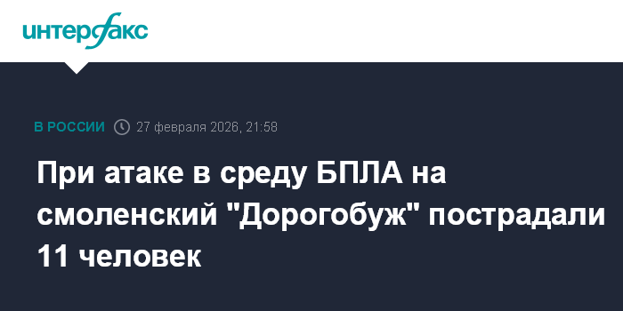 Москва. 27 февраля. INTERFAX.RU - Губернатор Смоленской области Василий Анохин сообщил, что в результате атаки украинских беспилотников в среду, 25 февраля, на завод ПАО "Дорогобуж" пострадали 11 человек; ранее сообщалось о семи погибших и 10 пострадавших.