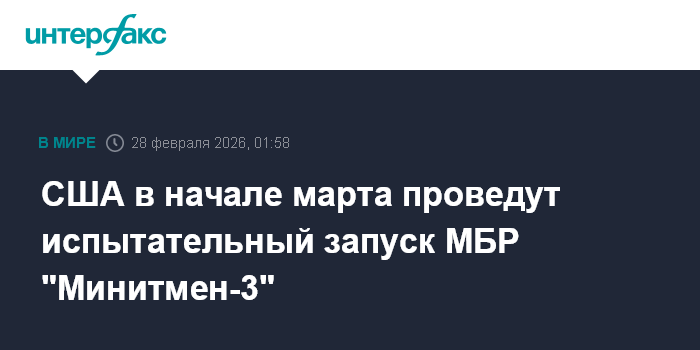 Москва. 27 февраля. INTERFAX.RU - Вашингтон с 4 по 5 марта проведет испытательный пуск невооруженной межконтинентальной баллистической ракеты Minuteman III с базы Ванденберг в Калифорнии, сообщило в пятницу Командование глобального удара ВВС США.