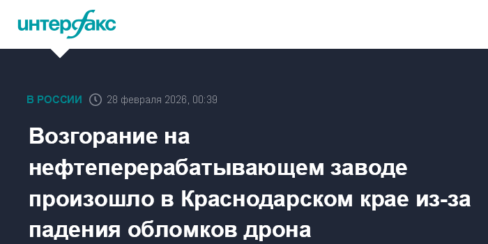 Возгорание на нефтеперерабатывающем заводе произошло в Краснодарском крае из-за падения обломков дрона