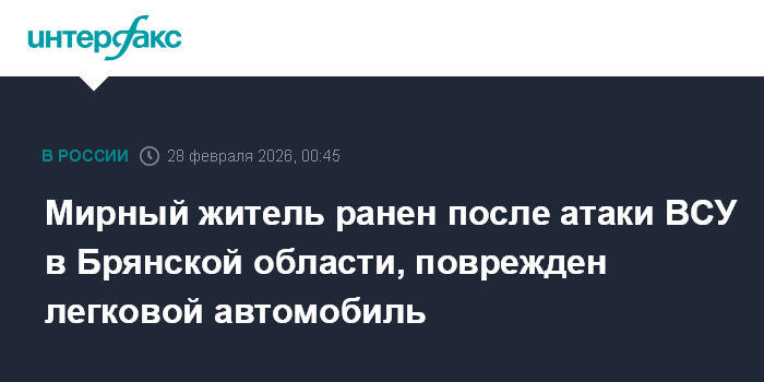 Москва. 28 февраля. INTERFAX.RU - Губернатор Брянской области Александр Богомаз сообщил, что ВСУ атаковали дронами село в Погарском районе, пострадал мирный житель.