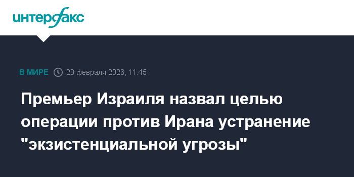 Москва. 28 февраля. INTERFAX.RU - Премьер-министр Израиля Биньямин Нетаньяху заявил, что военная операция против Ирана нацелена на устранение экзистенциальной угрозы для обоих государств.