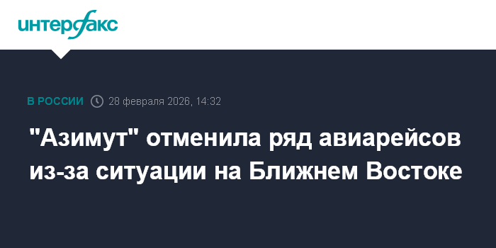 "Авиакомпания Азимут информирует о отмене рейсов А45087/5088 Сочи - Дубай / Дубай - Сочи и А46087/6088 Минеральные Воды - Дубай / Дубай - Минеральные Воды на 28 февраля 2026 года в связи с временным ограничением использования воздушного пространства ОАЭ, Ирана, Ирака Бахрейна, Саудовской Аравии и Катара", - говорится в сообщении.
