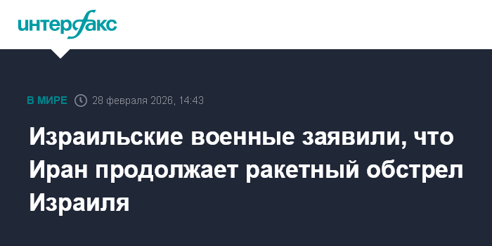Москва. 28 февраля. INTERFAX.RU - Иран продолжает ракетный обстрел Израиля, израильская армия действует по перехвату новой волны иранских ракет, заявила Армия обороны Израиля.
