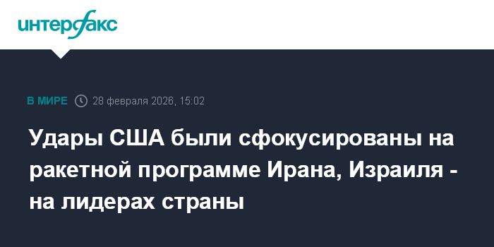Москва. 28 февраля. INTERFAX.RU - США сфокусировали свои удары по Ирану на объектах ракетной программы, тогда как Израиль взял на себя удары по иранским лидерам, сообщает журналист Axios Барак Равид со ссылкой на источник.