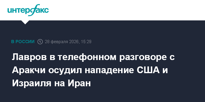 Лавров "осудил ничем не спровоцированное вооруженное нападение США и Израиля на Иран в нарушение принципов и норм международного права при полном игнорировании тяжелых последствий для региональной и глобальной стабильности и безопасности". Он указал на "необходимость незамедлительного прекращения атак против Исламской Республики и возвращения ситуации в русло политико-дипломатического урегулирования". При этом Лавров отметил "готовность России, в том числе в Совете Безопасности ООН, содействовать поиску мирных развязок на базе международного права, взаимного уважения и баланса интересов".
