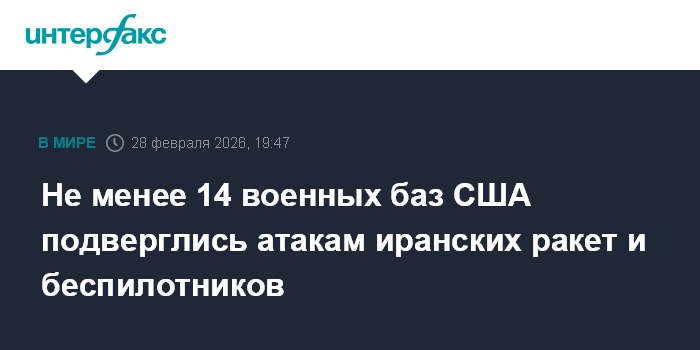 Москва. 28 февраля. INTERFAX.RU - В настоящий момент Иран нанес удары как минимум по 14 американским военным базам в ближневосточном регионе, сообщает "Тасним" со ссылкой на источник.