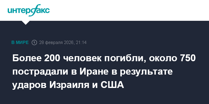 Москва. 28 февраля. INTERFAX.RU - По меньшей мере 201 человек погиб в результате ударов Израиля и США по Ирану в субботу, сообщают ближневосточные СМИ, ссылаясь на Общество Красного Полумесяца Исламской Республики Иран.