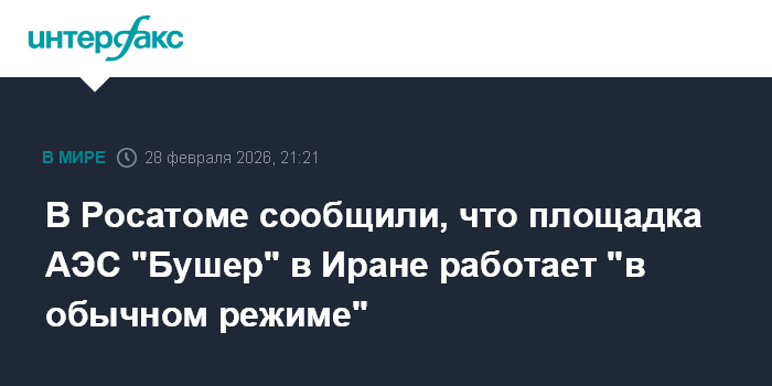 "Площадка АЭС Бушер в Иране на текущий момент (28 февраля, 19:00 мск - ИФ) продолжает работать в обычном режиме, военная операция в регионе на деятельности никак не сказалась", - говорится в комментарии.