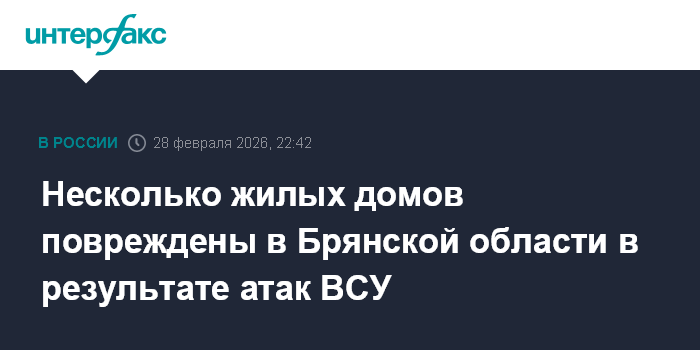 Москва. 28 февраля. INTERFAX.RU - Четыре жилых дома повреждены в ряде районов Брянской области в результате атак ВСУ, сообщил губернатор Александр Богомаз.