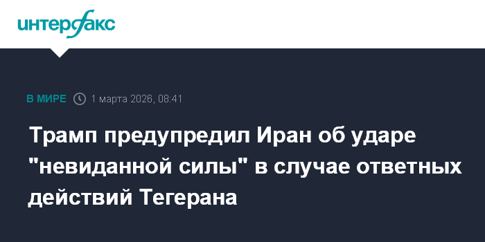 Москва. 1 марта. INTERFAX.RU - Президент США Дональд Трамп пообещал "невиданной силы" ответ Ирану, если тот предпримет новые удары.