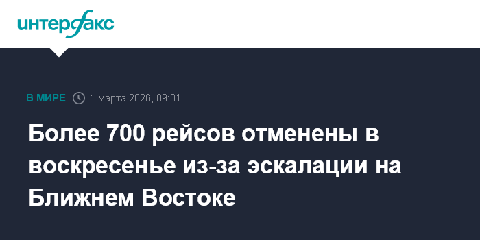 Москва. 1 марта. INTERFAX.RU - Более 700 рейсов отменены в воскресенье из-за обмена ударами между США, Израилем и Ираном, сообщает аналитическая компания Cirium.