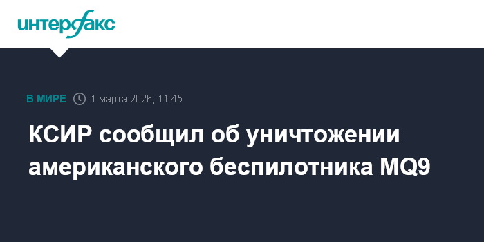 Москва. 1 марта. INTERFAX.RU - Корпус стражей Исламской революции (КСИР) проинформировал в воскресенье о том, что его воздушно-космическое подразделение уничтожило передовой американский беспилотник MQ9.