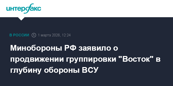 Минобороны РФ заявило о продвижении группировки "Восток" в глубину обороны ВСУ