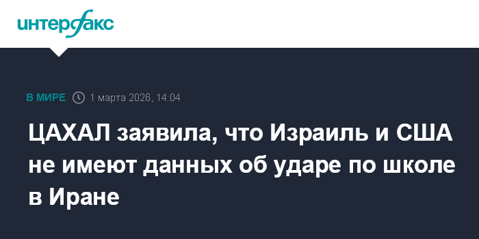Москва. 1 марта. INTERFAX.RU - У командования израильской армии нет никаких данных об ударе ВВС Израиля или США по школе в населенном пункте Минаб, где, согласно сообщению иранской стороны, погибли 148 человек.