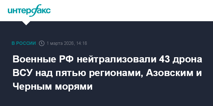 Москва. 1 марта. INTERFAX.RU - Российские военные с 8:00 до 14:00 по московскому времени перехватили и уничтожили 43 украинских беспилотника самолетного типа, сообщили в Минобороны РФ в воскресенье.