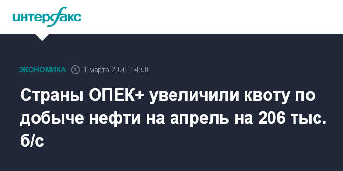 Москва. 1 марта. INTERFAX.RU - Восемь стран ОПЕК+ приняли решение об увеличении квот по добыче нефти на апрель на 206 тыс. баррелей в сутки "ввиду стабильных глобальных перспектив мировой экономики и здоровых рыночных показателей, отраженных в низких запасах нефти", говорится в пресс-релизе ОПЕК.