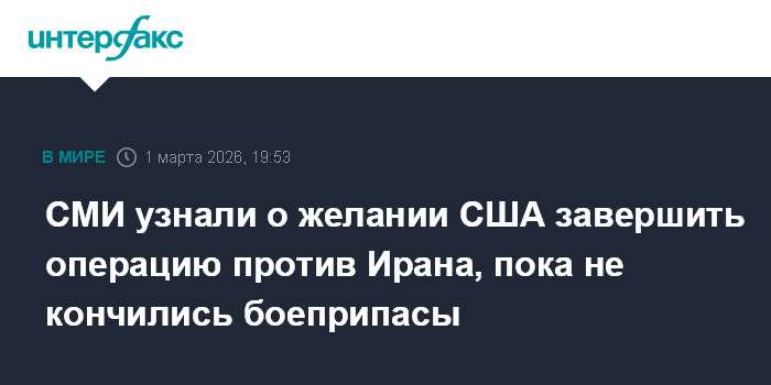 Москва. 1 марта. INTERFAX.RU - Соединенные Штаты торопятся завершить военную кампанию против Ирана раньше, чем у них кончатся боеприпасы, сообщает в воскресенье газета The Wall Street Journal, ссылаясь на американские официальные лица и экспертов.