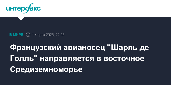 Москва. 1 марта. INTERFAX.RU - Французский авианосец "Шарль де Голль" отправлен в восточную часть Средиземноморья на фоне роста напряженности на Ближнем Востоке, сообщает в воскресенье телеканал БФМ-ТВ со ссылкой на источники.