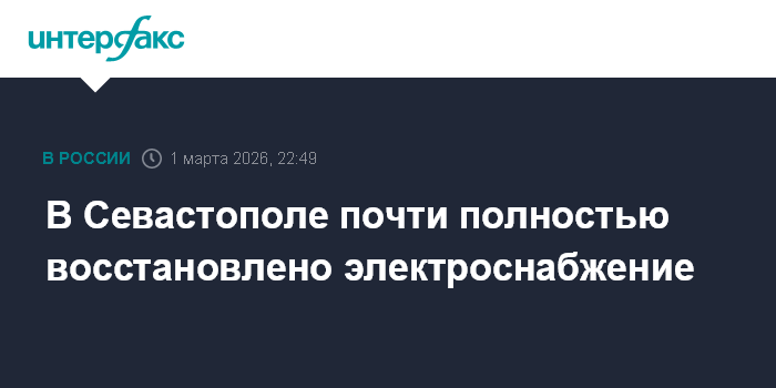 Москва. 1 марта. INTERFAX.RU - В Севастополе почти во всех районах восстановили электроснабжение, нарушенное вечером из-за аварийного отключения в сетях Крымской энергосистемы, сообщил губернатор города Михаил Развожаев.