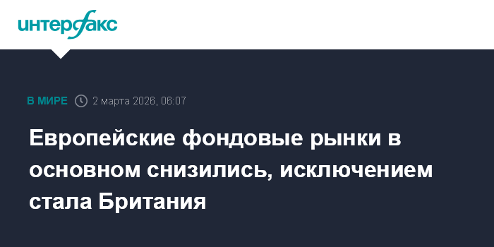 Москва. 2 марта. INTERFAX.RU - Европейские рынки акций в основном снизились по итогам торгов в пятницу, исключением стала Великобритания.